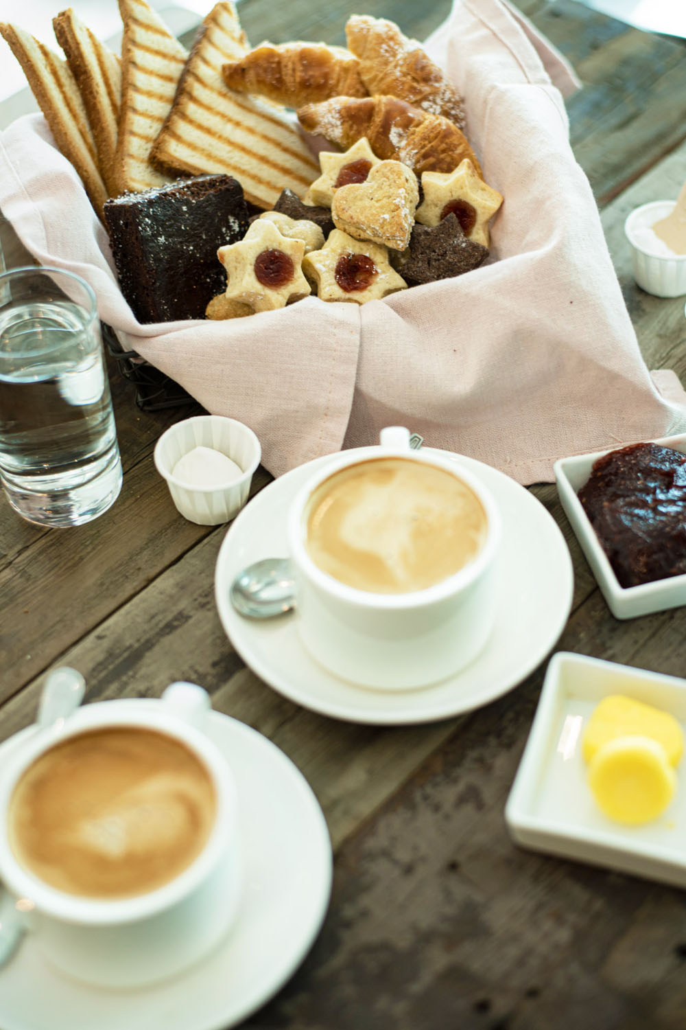 2 cortados o té + tres medialunas + brownie + ración de galletas + tostadas + mantequilla y mermelada.